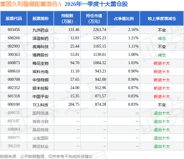 从基金规模来看,富国久利稳健配置混合A基金2026年一季度公布的基金规模为5.77亿元,较上一期规模4141.08万元变化了5.36亿元,环比变化了1293.28%。该基金最新一期资产配置为:股票占净值比27.4%,债券占净值比70.52%,现金占净值比0.8%。从基金持仓来看,该基金当季前十大股票仓位达10.92%,第一大重仓股为九洲药业(603456),持仓占比为2.16%。