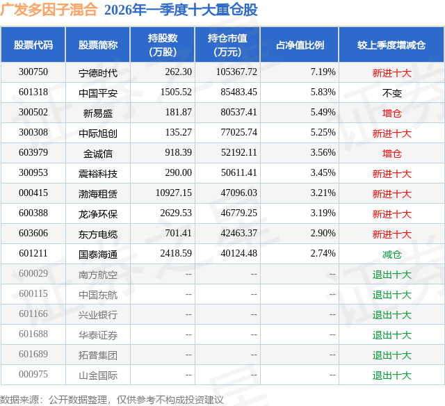 从基金规模来看,广发多因子混合基金2026年一季度公布的基金规模为146.64亿元,较上一期规模102.32亿元变化了44.32亿元,环比变化了43.31%。该基金最新一期资产配置为:股票占净值比91.65%,债券占净值比0.41%,现金占净值比8.93%。从基金持仓来看,该基金当季前十大股票仓位达42.81%,第一大重仓股为宁德时代(300750),持仓占比为7.19%。