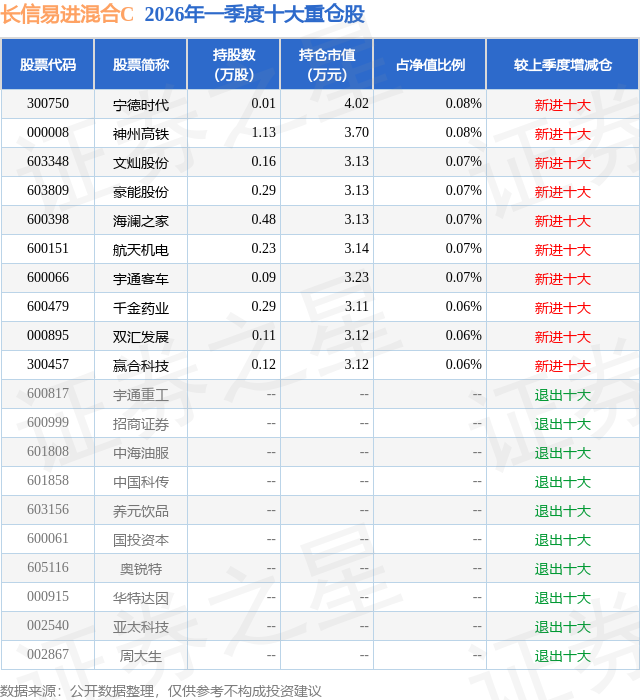 证券之星消息,日前长信易进混合C基金公布一季报,2026年一季度最新规模0.34亿元,季度净值涨幅为0.61%。