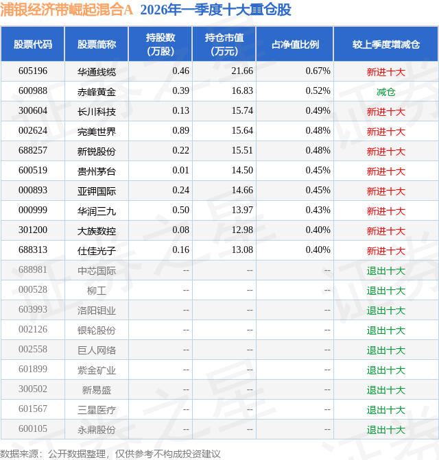 从基金规模来看,浦银经济带崛起混合A基金2026年一季度公布的基金规模为0.28亿元,较上一期规模2940.74万元变化了-143.22万元,环比变化了-4.87%。该基金最新一期资产配置为:股票占净值比21.81%,债券占净值比42.55%,现金占净值比1.73%。从基金持仓来看,该基金当季前十大股票仓位达4.77%,第一大重仓股为华通线缆(605196),持仓占比为0.67%。