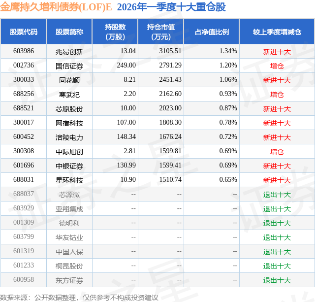 从基金规模来看,金鹰持久增利债券(LOF)E基金2026年一季度公布的基金规模为17.9亿元,较上一期规模7.02亿元变化了10.88亿元,环比变化了155.04%。该基金最新一期资产配置为:股票占净值比19.78%,债券占净值比97.18%,现金占净值比1.18%。从基金持仓来看,该基金当季前十大股票仓位达8.93%,第一大重仓股为兆易创新(603986),持仓占比为1.34%。