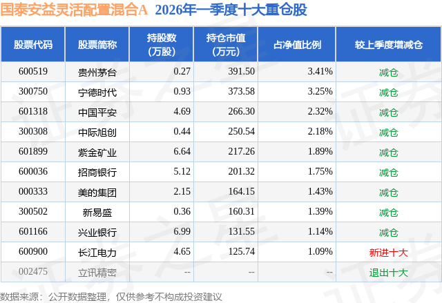 从基金规模来看,国泰安益灵活配置混合A基金2026年一季度公布的基金规模为0.83亿元,较上一期规模96.62万元变化了8173.65万元,环比变化了8459.69%。该基金最新一期资产配置为:股票占净值比94.05%,债券占净值比5.58%,现金占净值比1.13%。从基金持仓来看,该基金当季前十大股票仓位达19.85%,第一大重仓股为贵州茅台(600519),持仓占比为3.41%。