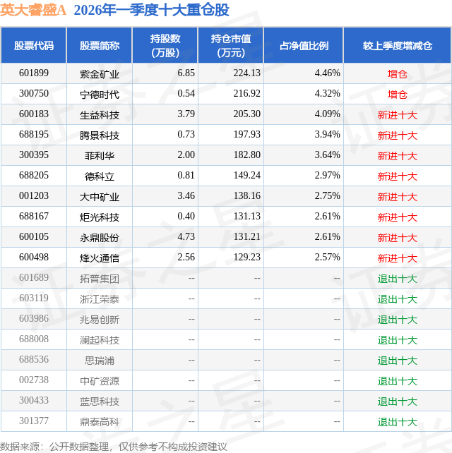 从基金规模来看,英大睿盛A基金2026年一季度公布的基金规模为0.45亿元,较上一期规模4535.64万元变化了-82.62万元,环比变化了-1.82%。该基金最新一期资产配置为:股票占净值比90.49%,无债券类资产,现金占净值比12.32%。从基金持仓来看,该基金当季前十大股票仓位达33.96%,第一大重仓股为紫金矿业(601899),持仓占比为4.46%。