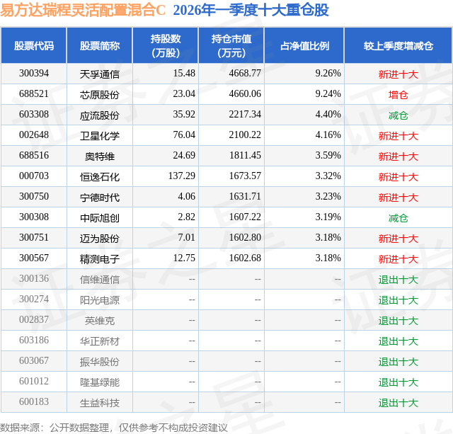 从基金规模来看,易方达瑞程灵活配置混合C基金2026年一季度公布的基金规模为1.29亿元,较上一期规模1.46亿元变化了-1699.62万元,环比变化了-11.67%。该基金最新一期资产配置为:股票占净值比92.47%,无债券类资产,现金占净值比7.2%。从基金持仓来看,该基金当季前十大股票仓位达46.75%,第一大重仓股为天孚通信(300394),持仓占比为9.26%。