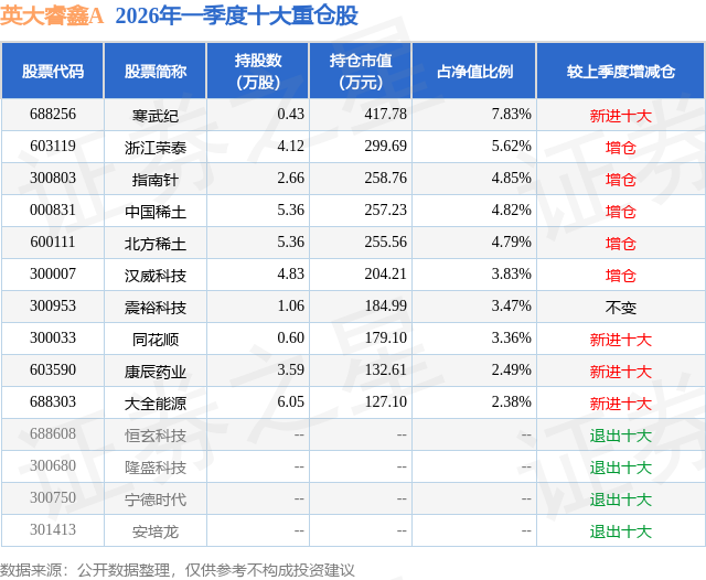 从基金规模来看,英大睿鑫A基金2026年一季度公布的基金规模为0.53亿元,较上一期规模5069.41万元变化了180.87万元,环比变化了3.57%。该基金最新一期资产配置为:股票占净值比92.22%,债券占净值比5.83%,现金占净值比0.41%。从基金持仓来看,该基金当季前十大股票仓位达43.44%,第一大重仓股为寒武纪(688256),持仓占比为7.83%。