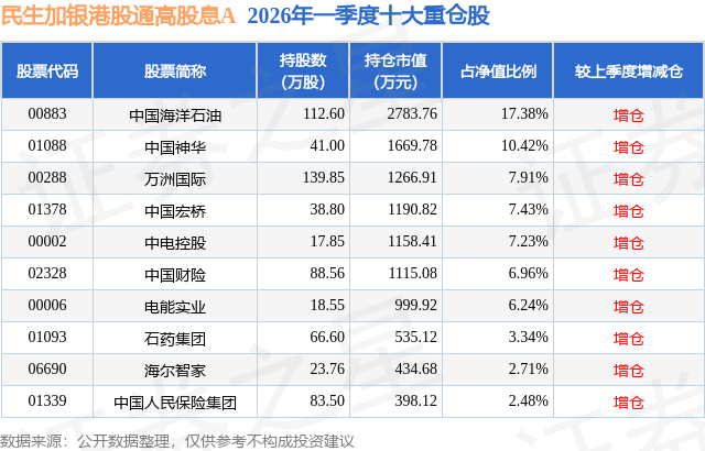 从基金规模来看,民生加银港股通高股息A基金2026年一季度公布的基金规模为1.13亿元,较上一期规模5425.66万元变化了5851.56万元,环比变化了107.85%。该基金最新一期资产配置为:股票占净值比93.96%,债券占净值比2.7%,现金占净值比4.07%。从基金持仓来看,该基金当季前十大股票仓位达72.1%,第一大重仓股为中国海洋石油(00883),持仓占比为17.38%。