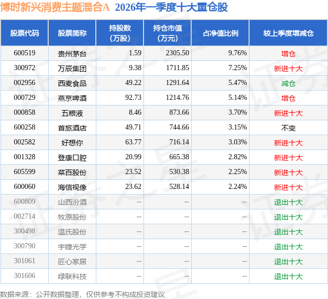 从基金规模来看,博时新兴消费主题混合A基金2026年一季度公布的基金规模为2.32亿元,较上一期规模3.27亿元变化了-9536.72万元,环比变化了-29.14%。该基金最新一期资产配置为:股票占净值比74.8%,无债券类资产,现金占净值比25.74%。从基金持仓来看,该基金当季前十大股票仓位达44.81%,第一大重仓股为贵州茅台(600519),持仓占比为9.76%。