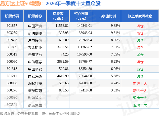 证券之星消息,日前易方达上证50增强C基金公布一季报,2026年一季度最新规模11.79亿元,季度净值涨幅为-5.94%。