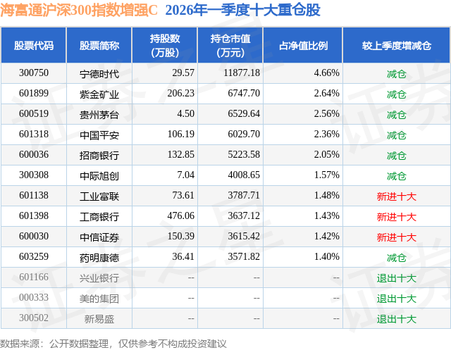 从基金规模来看,海富通沪深300指数增强C基金2026年一季度公布的基金规模为11.79亿元,较上一期规模16.77亿元变化了-4.98亿元,环比变化了-29.7%。该基金最新一期资产配置为:股票占净值比93.4%,债券占净值比4.0%,现金占净值比2.84%。从基金持仓来看,该基金当季前十大股票仓位达21.57%,第一大重仓股为宁德时代(300750),持仓占比为4.66%。