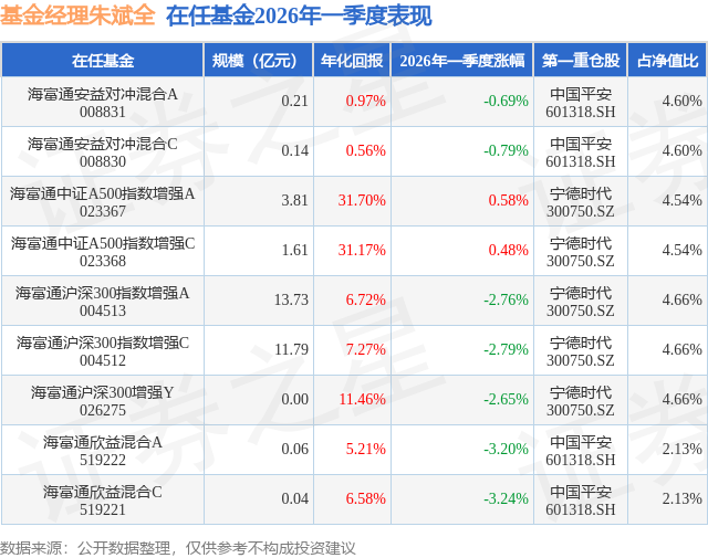 证券之星消息,日前海富通沪深300指数增强C基金公布一季报,2026年一季度最新规模11.79亿元,季度净值涨幅为-2.79%。