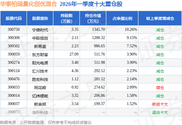从基金规模来看,华泰柏瑞量化创优混合基金2026年一季度公布的基金规模为1.31亿元,较上一期规模6997.82万元变化了6123.53万元,环比变化了87.51%。该基金最新一期资产配置为:股票占净值比93.92%,债券占净值比1.76%,现金占净值比4.43%。从基金持仓来看,该基金当季前十大股票仓位达44.29%,第一大重仓股为宁德时代(300750),持仓占比为10.26%。