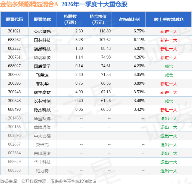 从基金规模来看,金信多策略精选混合A基金2026年一季度公布的基金规模为0.12亿元,较上一期规模2232.05万元变化了-1015.42万元,环比变化了-45.49%。该基金最新一期资产配置为:股票占净值比86.48%,无债券类资产,现金占净值比12.23%。从基金持仓来看,该基金当季前十大股票仓位达44.74%,第一大重仓股为英诺激光(301021),持仓占比为6.75%。