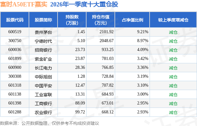 从基金规模来看,富时A50ETF嘉实基金2026年一季度公布的基金规模为2.28亿元,较上一期规模2.55亿元变化了-2693.9万元,环比变化了-10.55%。该基金最新一期资产配置为:股票占净值比99.37%,无债券类资产,现金占净值比0.64%。从基金持仓来看,该基金当季前十大股票仓位达44.22%,第一大重仓股为贵州茅台(600519),持仓占比为9.21%。