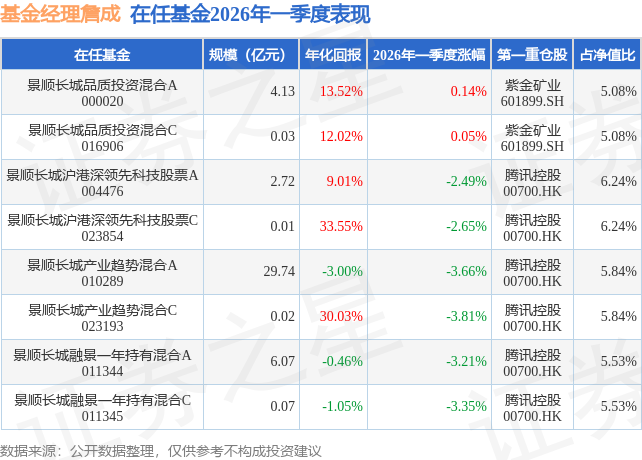 从基金规模来看,景顺长城沪港深领先科技股票A基金2026年一季度公布的基金规模为2.72亿元,较上一期规模4.57亿元变化了-1.85亿元,环比变化了-40.42%。该基金最新一期资产配置为:股票占净值比85.3%,债券占净值比1.98%,现金占净值比7.8%。从基金持仓来看,该基金当季前十大股票仓位达36.48%,第一大重仓股为腾讯控股(00700),持仓占比为6.24%。