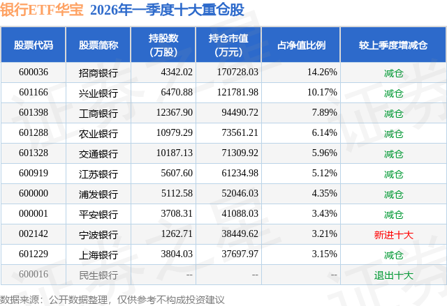 证券之星消息,日前银行ETF华宝基金公布一季报,2026年一季度最新规模119.71亿元,季度净值涨幅为-2.85%。