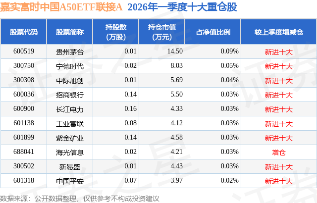 从基金规模来看,嘉实富时中国A50ETF联接A基金2026年一季度公布的基金规模为0.9亿元,较上一期规模1.19亿元变化了-2879.35万元,环比变化了-24.28%。该基金最新一期资产配置为:股票占净值比0.79%,无债券类资产,现金占净值比5.42%。从基金持仓来看,该基金当季前十大股票仓位达0.38%,第一大重仓股为贵州茅台(600519),持仓占比为0.09%。
