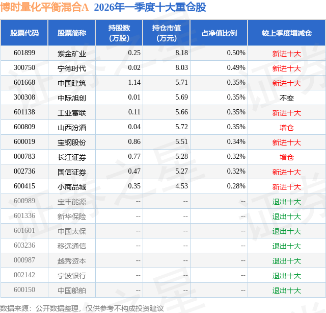 从基金规模来看,博时量化平衡混合A基金2026年一季度公布的基金规模为0.16亿元,较上一期规模2.74亿元变化了-2.57亿元,环比变化了-94.11%。该基金最新一期资产配置为:股票占净值比20.57%,债券占净值比5.58%,现金占净值比4.17%。从基金持仓来看,该基金当季前十大股票仓位达3.65%,第一大重仓股为紫金矿业(601899),持仓占比为0.5%。