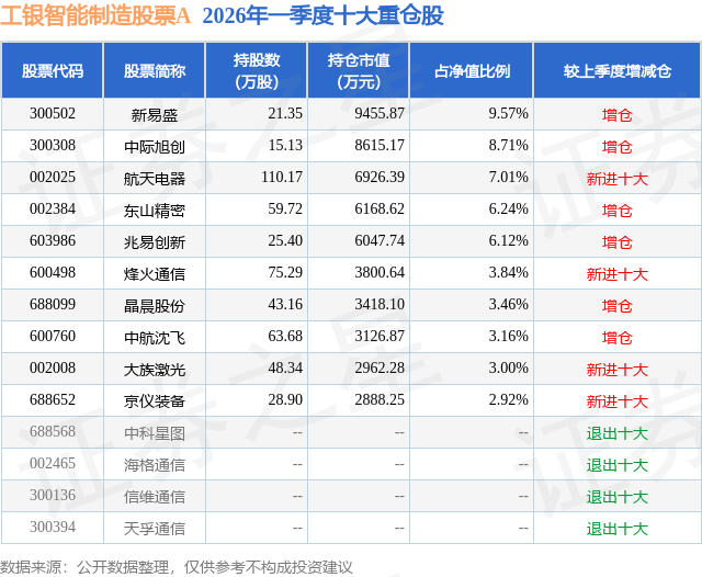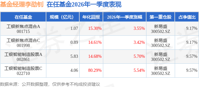 从基金规模来看,工银智能制造股票A基金2026年一季度公布的基金规模为5.83亿元,较上一期规模7940.26万元变化了5.03亿元,环比变化了633.79%。该基金最新一期资产配置为:股票占净值比94.59%,无债券类资产,现金占净值比6.01%。从基金持仓来看,该基金当季前十大股票仓位达54.03%,第一大重仓股为新易盛(300502),持仓占比为9.57%。