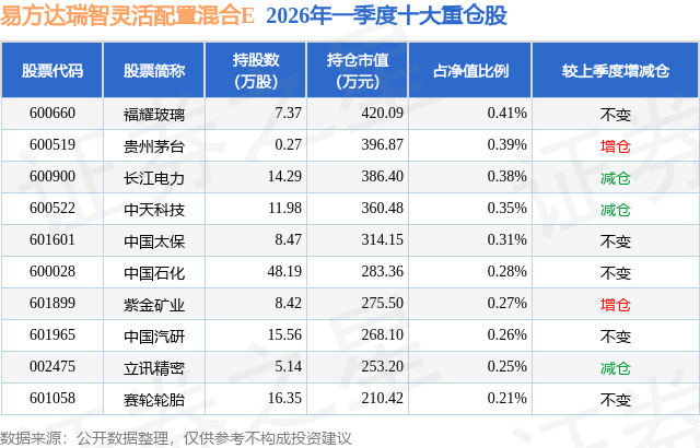 从基金规模来看,易方达瑞智灵活配置混合E基金2026年一季度公布的基金规模为6.26亿元,较上一期规模8.19亿元变化了-1.92亿元,环比变化了-23.51%。该基金最新一期资产配置为:股票占净值比8.22%,债券占净值比104.69%,现金占净值比2.72%。从基金持仓来看,该基金当季前十大股票仓位达3.11%,第一大重仓股为福耀玻璃(600660),持仓占比为0.41%。