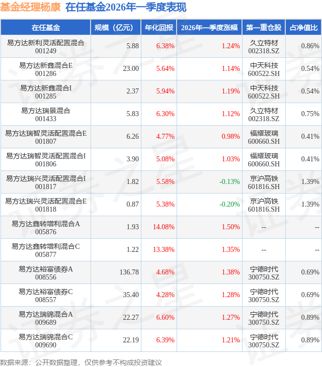 证券之星消息,日前易方达瑞智灵活配置混合E基金公布一季报,2026年一季度最新规模6.26亿元,季度净值涨幅为0.98%。