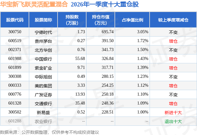 从基金规模来看,华宝新飞跃灵活配置混合基金2026年一季度公布的基金规模为2.28亿元,较上一期规模2.24亿元变化了432.72万元,环比变化了1.94%。该基金最新一期资产配置为:股票占净值比53.77%,债券占净值比24.9%,现金占净值比2.87%。从基金持仓来看,该基金当季前十大股票仓位达14.63%,第一大重仓股为宁德时代(300750),持仓占比为3.05%。