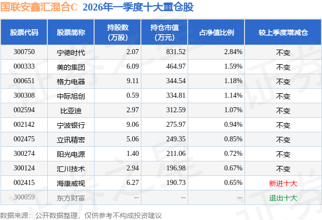 证券之星消息,日前国联安鑫汇混合C基金公布一季报,2026年一季度最新规模0.0亿元,季度净值涨幅为-0.44%。