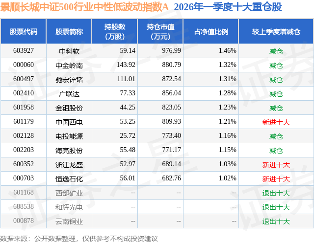 从基金规模来看,景顺长城中证500行业中性低波动指数A基金2026年一季度公布的基金规模为6.54亿元,较上一期规模9.35亿元变化了-2.8亿元,环比变化了-30.0%。该基金最新一期资产配置为:股票占净值比94.33%,无债券类资产,现金占净值比5.7%。从基金持仓来看,该基金当季前十大股票仓位达12.17%,第一大重仓股为中科软(603927),持仓占比为1.46%。