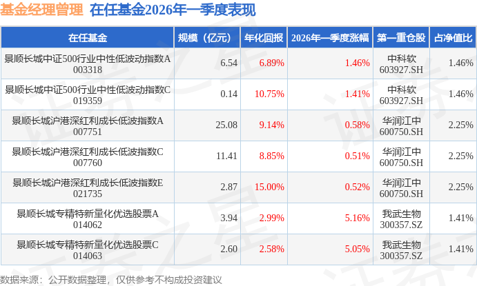证券之星消息,日前景顺长城中证500行业中性低波动指数A基金公布一季报,2026年一季度最新规模6.54亿元,季度净值涨幅为1.46%。