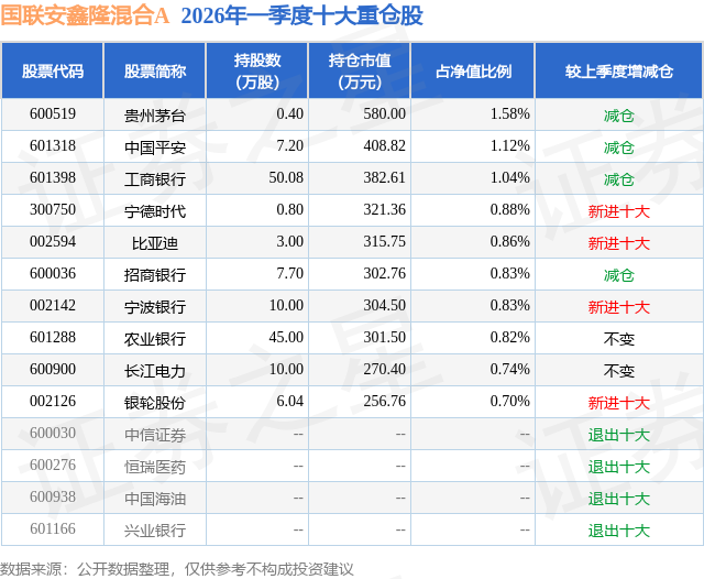 从基金规模来看,国联安鑫隆混合A基金2026年一季度公布的基金规模为3.37亿元,较上一期规模3.19亿元变化了1838.02万元,环比变化了5.76%。该基金最新一期资产配置为:股票占净值比34.62%,债券占净值比64.53%,现金占净值比0.32%。从基金持仓来看,该基金当季前十大股票仓位达9.4%,第一大重仓股为贵州茅台(600519),持仓占比为1.58%。