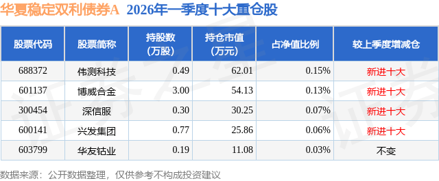 从基金规模来看,华夏稳定双利债券A基金2026年一季度公布的基金规模为1.25亿元,较上一期规模14.78亿元变化了-13.53亿元,环比变化了-91.57%。该基金最新一期资产配置为:股票占净值比0.45%,债券占净值比127.36%,现金占净值比2.28%。从基金持仓来看,该基金当季前十大股票仓位达0.44%,第一大重仓股为伟测科技(688372),持仓占比为0.15%。
