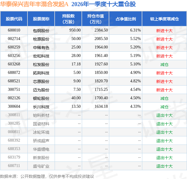 从基金规模来看,华泰保兴吉年丰混合发起A基金2026年一季度公布的基金规模为3.57亿元,较上一期规模2.96亿元变化了6132.53万元,环比变化了20.72%。该基金最新一期资产配置为:股票占净值比94.08%,无债券类资产,现金占净值比7.46%。从基金持仓来看,该基金当季前十大股票仓位达50.41%,第一大重仓股为包钢股份(600010),持仓占比为6.31%。