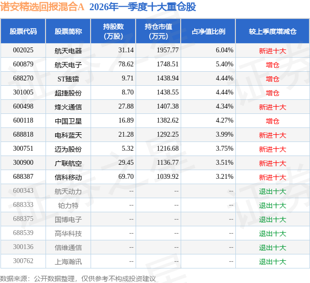 从基金规模来看,诺安精选回报混合A基金2026年一季度公布的基金规模为1.45亿元,较上一期规模2542.72万元变化了1.19亿元,环比变化了469.64%。该基金最新一期资产配置为:股票占净值比93.43%,无债券类资产,现金占净值比6.96%。从基金持仓来看,该基金当季前十大股票仓位达43.39%,第一大重仓股为航天电器(002025),持仓占比为6.04%。