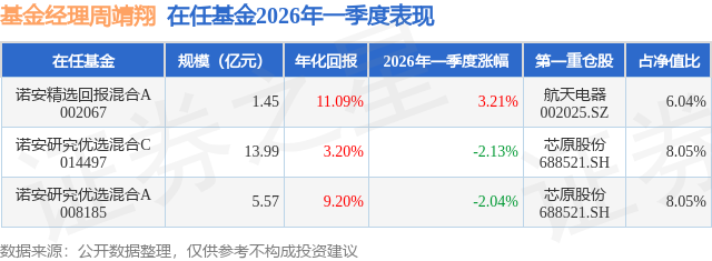 诺安精选回报混合A现任基金经理为周靖翔,本季度增聘基金经理周靖翔,近期离任的基金经理为杨谷。其中在任基金经理周靖翔已从业0年又127天,2025年12月24日正式接手管理诺安精选回报混合A,任职期间累计回报为26.92%。目前还管理着3只基金产品(包括A类和C类),其中本季度表现最佳的基金为诺安精选回报混合A(002067),季度净值涨幅为3.21%。