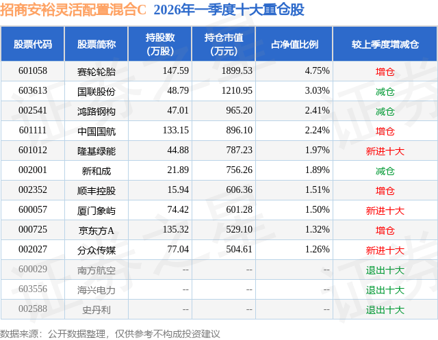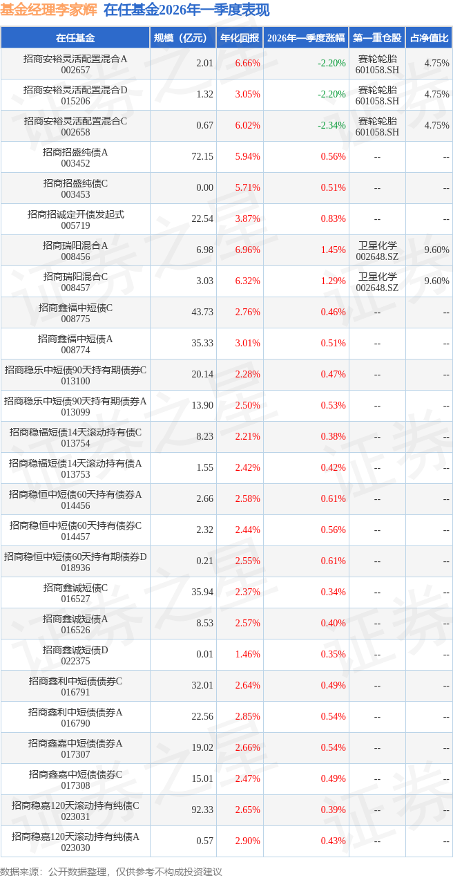 证券之星消息,日前招商安裕灵活配置混合C基金公布一季报,2026年一季度最新规模0.67亿元,季度净值涨幅为-2.34%。