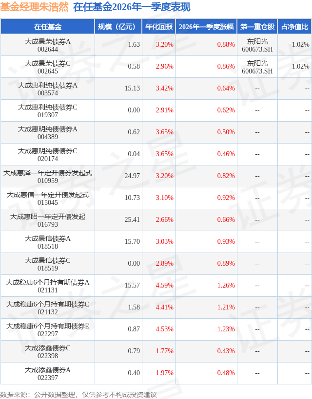 证券之星消息,日前大成景荣债券A基金公布一季报,2026年一季度最新规模1.63亿元,季度净值涨幅为0.88%。