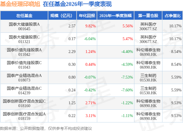 国泰大健康股票A现任基金经理为邱晓旭。其中在任基金经理邱晓旭已从业3年又252天,2026年4月8日正式接手管理国泰大健康股票A,任职期间累计回报为-0.14%。目前还管理着8只基金产品(包括A类和C类),其中本季度表现最佳的基金为国泰大健康股票A(001645),季度净值涨幅为5.56%。