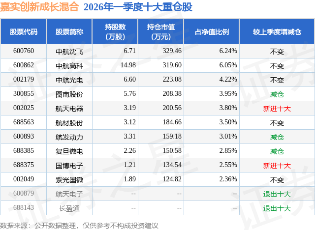 从基金规模来看,嘉实创新成长混合基金2026年一季度公布的基金规模为0.53亿元,较上一期规模8144.7万元变化了-2863.33万元,环比变化了-35.16%。该基金最新一期资产配置为:股票占净值比43.27%,债券占净值比0.57%,现金占净值比56.69%。从基金持仓来看,该基金当季前十大股票仓位达38.53%,第一大重仓股为中航沈飞(600760),持仓占比为6.24%。