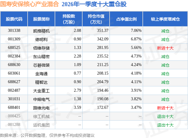 从基金规模来看,国寿安保核心产业混合基金2026年一季度公布的基金规模为0.5亿元,较上一期规模1.31亿元变化了-8090.23万元,环比变化了-61.9%。该基金最新一期资产配置为:股票占净值比85.93%,无债券类资产,现金占净值比14.24%。从基金持仓来看,该基金当季前十大股票仓位达48.05%,第一大重仓股为凯格精机(301338),持仓占比为7.06%。