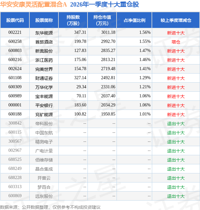 从基金规模来看,华安安康灵活配置混合A基金2026年一季度公布的基金规模为15.87亿元,较上一期规模25.38亿元变化了-9.51亿元,环比变化了-37.46%。该基金最新一期资产配置为:股票占净值比27.4%,债券占净值比60.53%,现金占净值比6.94%。从基金持仓来看,该基金当季前十大股票仓位达13.08%,第一大重仓股为东华能源(002221),持仓占比为1.56%。