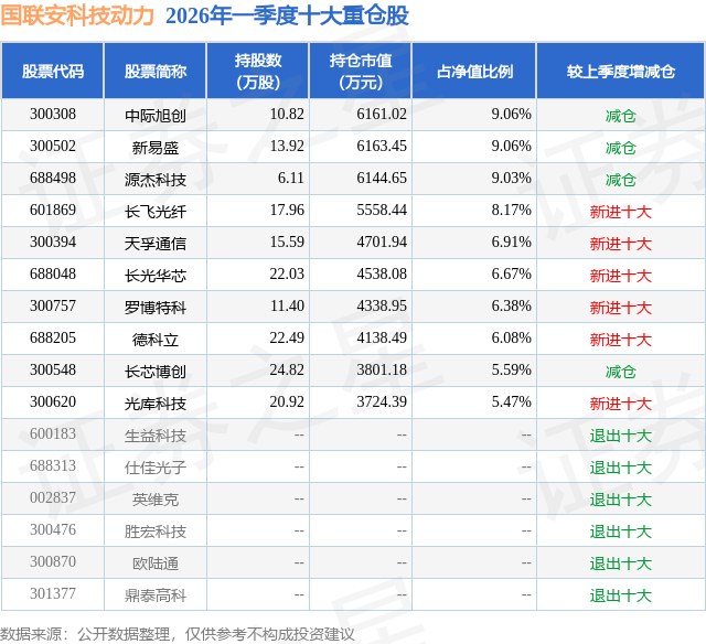 从基金规模来看,国联安科技动力基金2026年一季度公布的基金规模为6.8亿元,较上一期规模6.6亿元变化了2079.87万元,环比变化了3.15%。该基金最新一期资产配置为:股票占净值比92.53%,无债券类资产,现金占净值比8.47%。从基金持仓来看,该基金当季前十大股票仓位达72.42%,第一大重仓股为中际旭创(300308),持仓占比为9.06%。