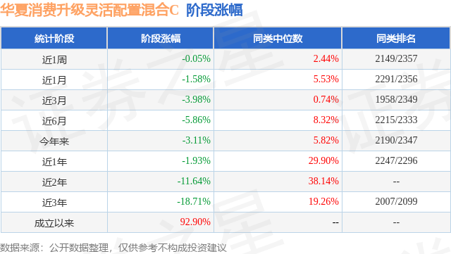 从业绩表现来看,华夏消费升级灵活配置混合C基金过去一年净值涨幅为-1.93%,在同类基金中排名2247/2296,同类基金过去一年净值涨幅中位数为29.9%。而基金过去一年的最大回撤为-11.86%,成立以来的最大回撤为-50.49%。
