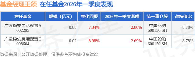 从基金规模来看,广发稳安灵活配置A基金2026年一季度公布的基金规模为0.88亿元,较上一期规模1.1亿元变化了-2157.57万元,环比变化了-19.64%。该基金最新一期资产配置为:股票占净值比92.38%,无债券类资产,现金占净值比7.37%。从基金持仓来看,该基金当季前十大股票仓位达53.26%,第一大重仓股为中国船舶(600150),持仓占比为8.78%。