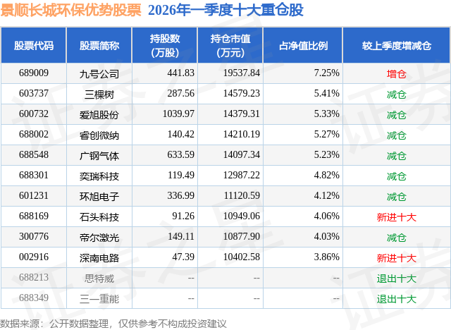 从基金规模来看,景顺长城环保优势股票基金2026年一季度公布的基金规模为26.97亿元,较上一期规模25.8亿元变化了1.16亿元,环比变化了4.5%。该基金最新一期资产配置为:股票占净值比90.75%,无债券类资产,现金占净值比9.36%。从基金持仓来看,该基金当季前十大股票仓位达49.38%,第一大重仓股为九号公司(689009),持仓占比为7.25%。