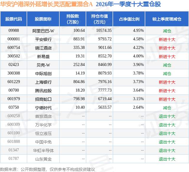 从基金规模来看,华安沪港深外延增长灵活配置混合A基金2026年一季度公布的基金规模为18.97亿元,较上一期规模28.09亿元变化了-9.12亿元,环比变化了-32.45%。该基金最新一期资产配置为:股票占净值比87.86%,无债券类资产,现金占净值比12.55%。从基金持仓来看,该基金当季前十大股票仓位达38.65%,第一大重仓股为阿里巴巴-W(09988),持仓占比为4.95%。
