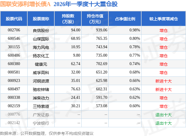 从基金规模来看,国联安添利增长债A基金2026年一季度公布的基金规模为9.08亿元,较上一期规模4.58亿元变化了4.5亿元,环比变化了98.09%。该基金最新一期资产配置为:股票占净值比14.01%,债券占净值比81.94%,现金占净值比10.82%。从基金持仓来看,该基金当季前十大股票仓位达7.26%,第一大重仓股为良信股份(002706),持仓占比为0.98%。