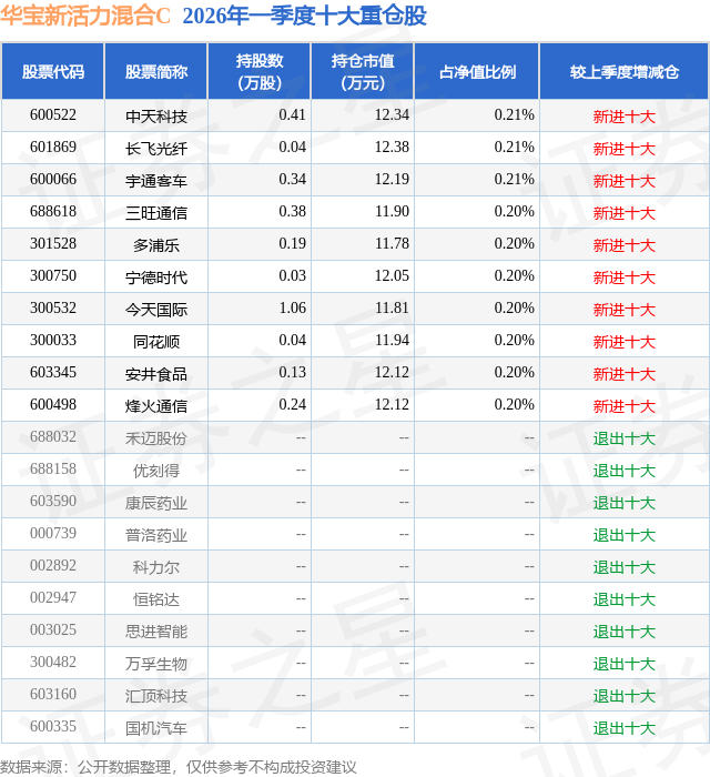 从基金规模来看,华宝新活力混合C基金2026年一季度公布的基金规模为0.48亿元,较上一期规模5246.16万元变化了-466.33万元,环比变化了-8.89%。该基金最新一期资产配置为:股票占净值比89.84%,无债券类资产,现金占净值比10.48%。从基金持仓来看,该基金当季前十大股票仓位达2.03%,第一大重仓股为中天科技(600522),持仓占比为0.21%。