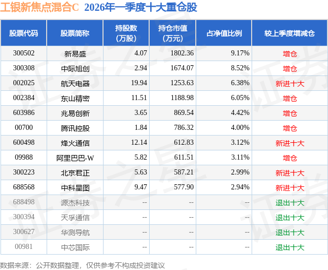 从基金规模来看,工银新焦点混合C基金2026年一季度公布的基金规模为0.89亿元,较上一期规模2911.92万元变化了6016.45万元,环比变化了206.61%。该基金最新一期资产配置为:股票占净值比94.68%,无债券类资产,现金占净值比10.24%。从基金持仓来看,该基金当季前十大股票仓位达50.7%,第一大重仓股为新易盛(300502),持仓占比为9.17%。