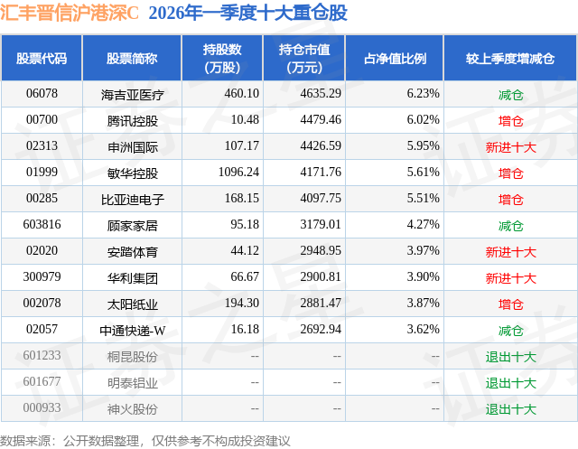 从基金规模来看,汇丰晋信沪港深C基金2026年一季度公布的基金规模为4.51亿元,较上一期规模2008.61万元变化了4.31亿元,环比变化了2143.44%。该基金最新一期资产配置为:股票占净值比90.07%,无债券类资产,现金占净值比13.69%。从基金持仓来看,该基金当季前十大股票仓位达48.95%,第一大重仓股为海吉亚医疗(06078),持仓占比为6.23%。