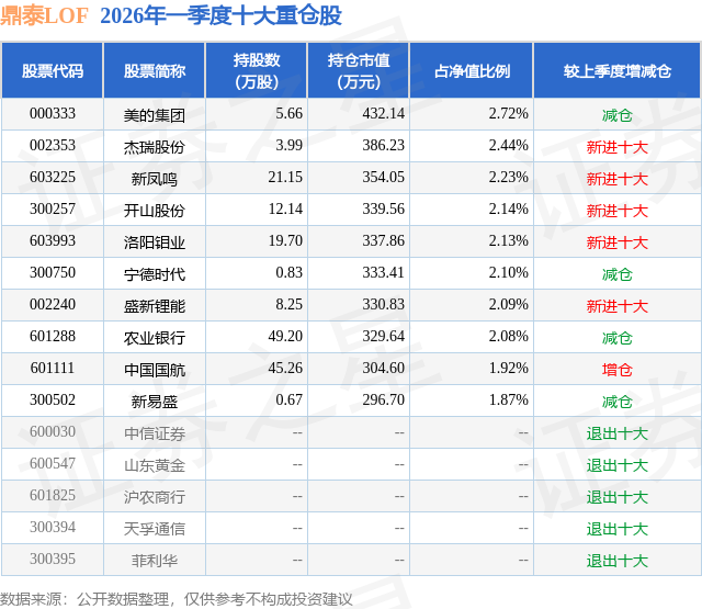 从基金规模来看,鼎泰LOF基金2026年一季度公布的基金规模为1.59亿元,较上一期规模2.48亿元变化了-8919.56万元,环比变化了-36.0%。该基金最新一期资产配置为:股票占净值比72.85%,无债券类资产,现金占净值比27.58%。从基金持仓来看,该基金当季前十大股票仓位达21.72%,第一大重仓股为美的集团(000333),持仓占比为2.72%。
