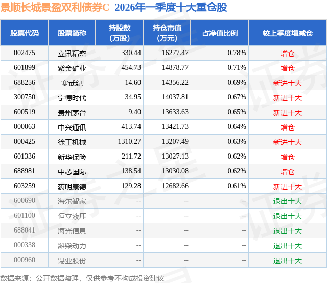 从基金规模来看,景顺长城景盈双利债券C基金2026年一季度公布的基金规模为29.95亿元,较上一期规模4133.25万元变化了29.53亿元,环比变化了7145.07%。该基金最新一期资产配置为:股票占净值比18.4%,债券占净值比88.24%,现金占净值比0.17%。从基金持仓来看,该基金当季前十大股票仓位达6.62%,第一大重仓股为立讯精密(002475),持仓占比为0.78%。